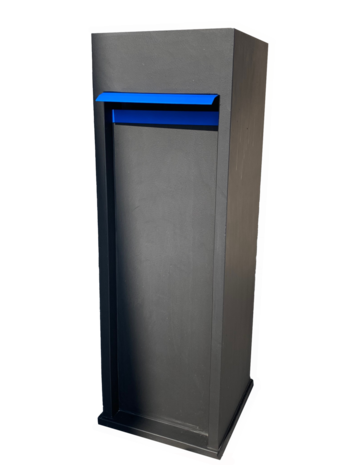 Luxueuze brievenbus in hardsteen (arduin) - voorzien van een coating en afgewerkt met zwarte lak - voor vrijstaande plaatsing van het merk Postboxstore. Afgewerkt met alu klep blauw.